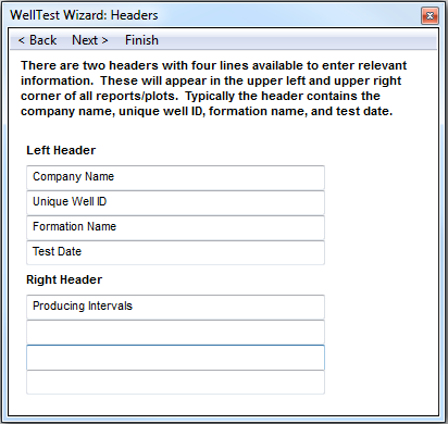 In this dialog box, you can type the headers you would like displayed in the top corners of all reports and plots that are created within WellTest.