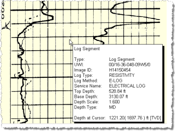), popup information that shows the depth and elevation at the cursor as the cursor moves over a log segment, top, depth track, or depth registration.
