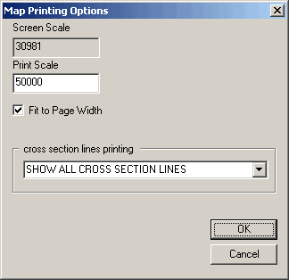 From the Cross Section Lines Printing drop-down list, select whether to print the current cross section line, all cross section lines within the screen extents, or no cross section lines.