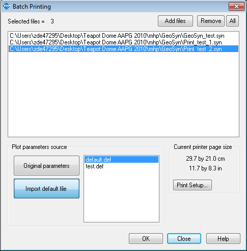 4. Select either Original parameters to print each file using display parameters specified in its own file, or Import default file to select a default file from the current GeoSyn Working directory from which to use parameters.