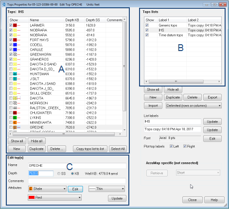 The display properties of tops including formation name, depth, marker attributes, and lithology can be modified. Customized tops can be copied to multiple tops lists and displayed in the main synthetic display.