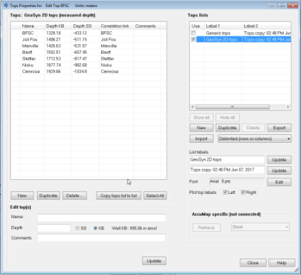 The display properties of tops including formation name, depth, marker attributes, and lithology can be modified. Customized tops can be copied to multiple tops lists and displayed in the main synthetic display.
