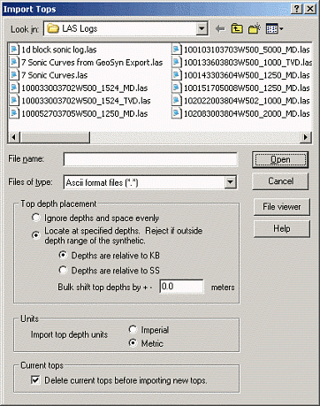 You can import tops lists saved in GeoSyn, LAS, or ASCII format into the GeoSyn tops list to make them available to your current model. When importing tops, you have the option of overwriting existing tops in the list, if you keep the current tops, imported tops with the same name appear alongside them.