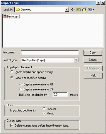 4. Browse to the desired GeoSyn file and select the depth placement options, units, and whether to delete current tops if importing into a tops list that's already populated, and then click OK.
