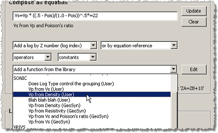 and then do either of the following to modify the equation. If the desired function doesn't appear, click Edit to the right of the drop-down list to launch the Log Equation Editor dialog box and create it.