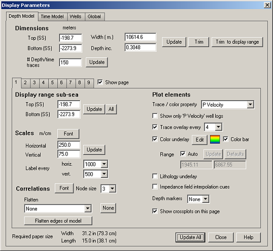 Set depth model properties including the overall size of the canvas, the depth increment with which to resample the impedance field, properties for scales, traces, correlations, and correlation nodes.