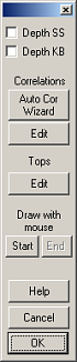 The border of the depth page canvas is one large correlation and the outside border of each well another. Crossing these objects with a correlation line automatically latches the correlation line to the canvas or the well border. Crossing an existing correlation line while drawing a new correlation line latches the new correlation line to the existing one and ends the current correlation.